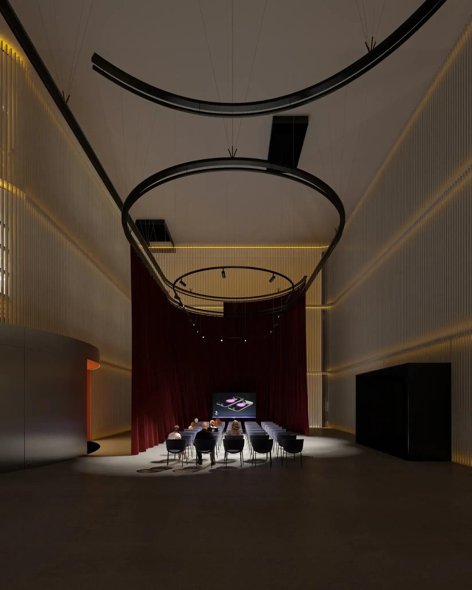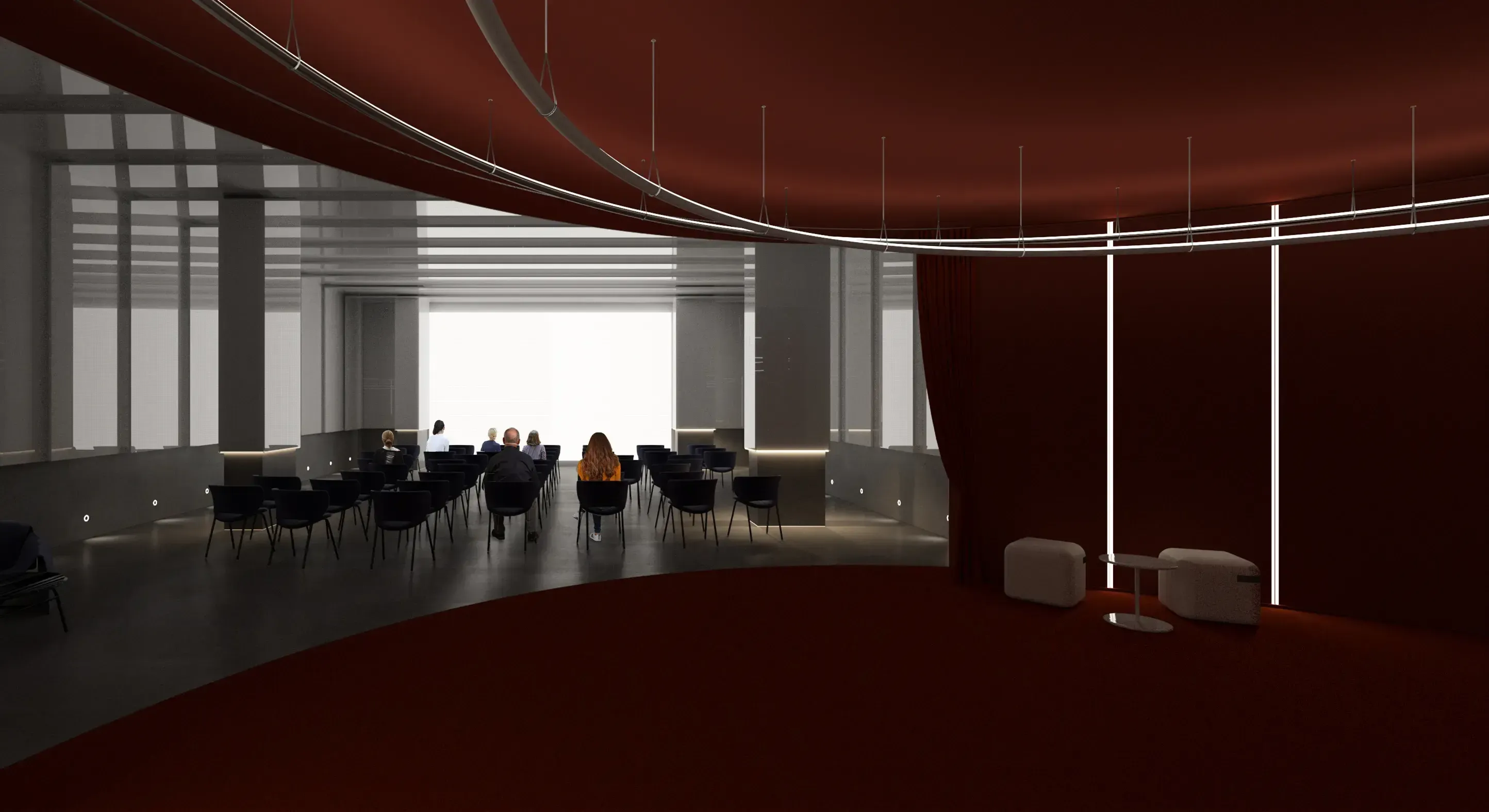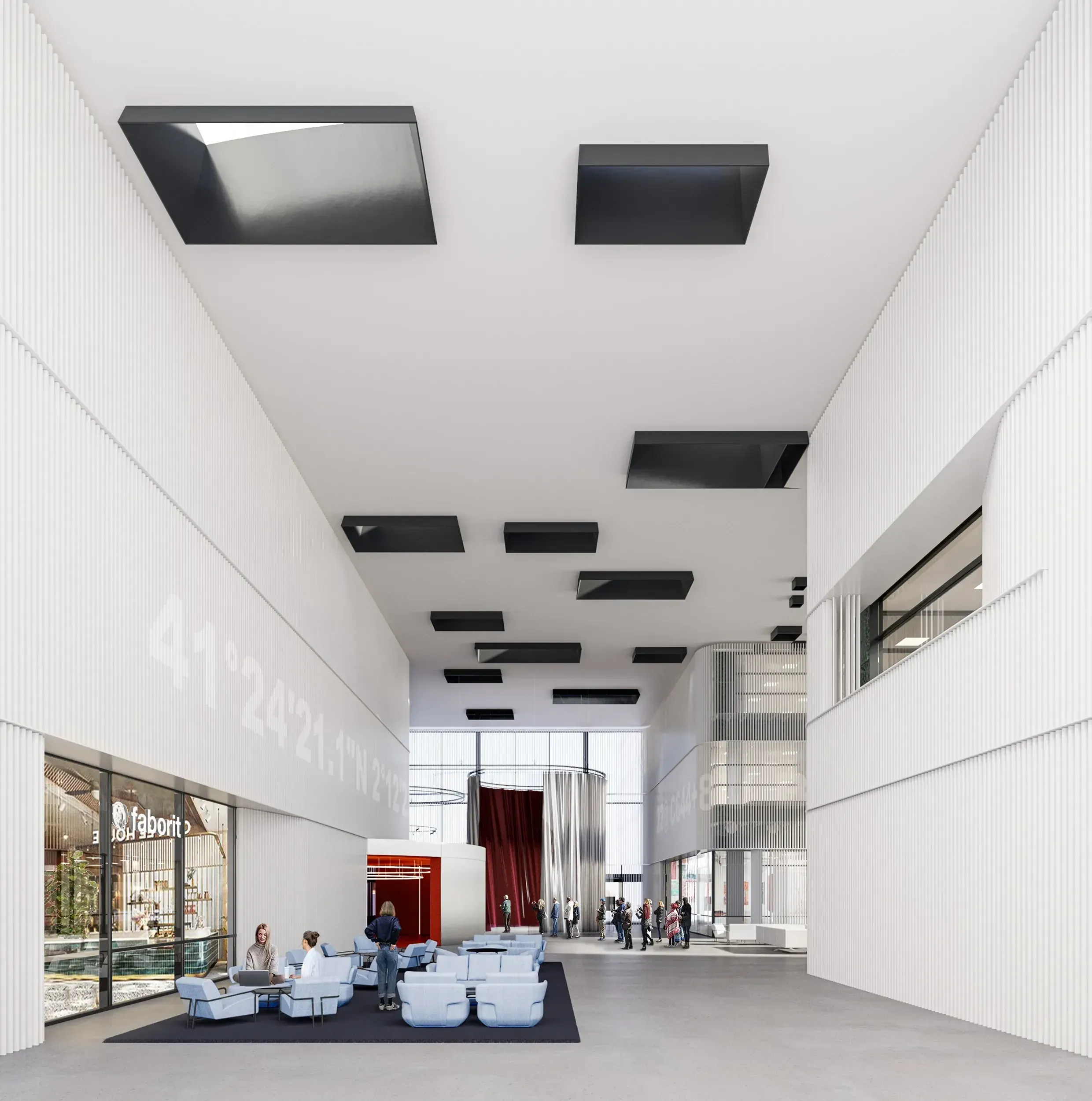 La nueva piel de lamas metálicas orientables resuelve la privacidad de oficinas circundantes mientras permite usos expositivos. La gran altura de 12,5 metros se convierte en oportunidad espacial para eventos corporativos.