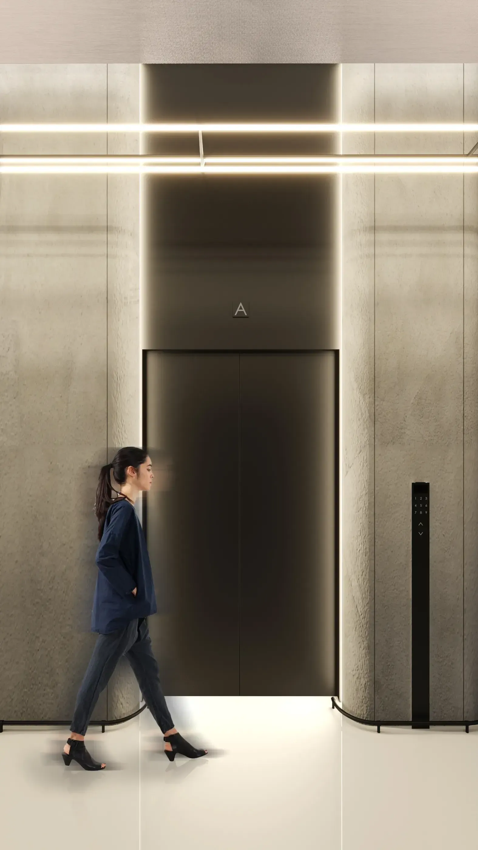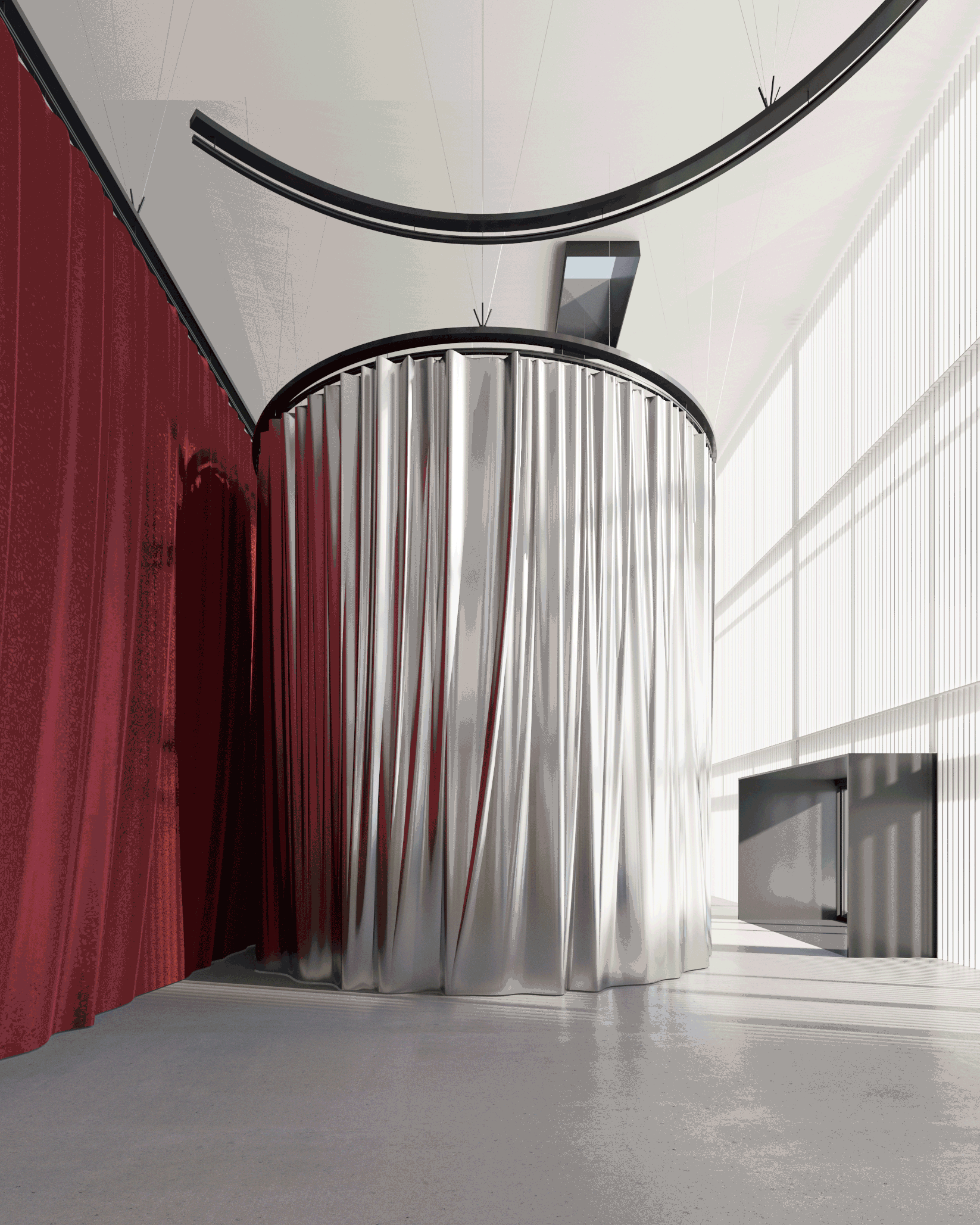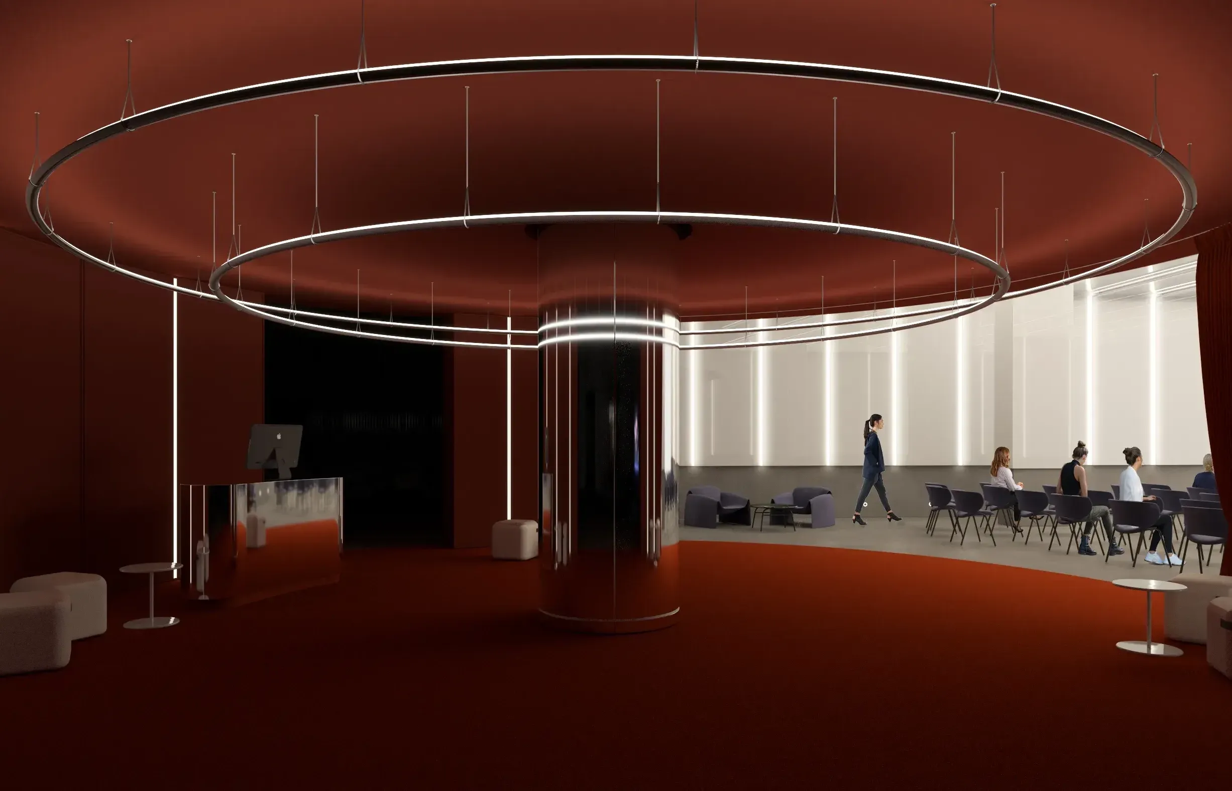 La nueva piel de lamas metálicas orientables resuelve la privacidad de oficinas circundantes mientras permite usos expositivos. La gran altura de 12,5 metros se convierte en oportunidad espacial para eventos corporativos.