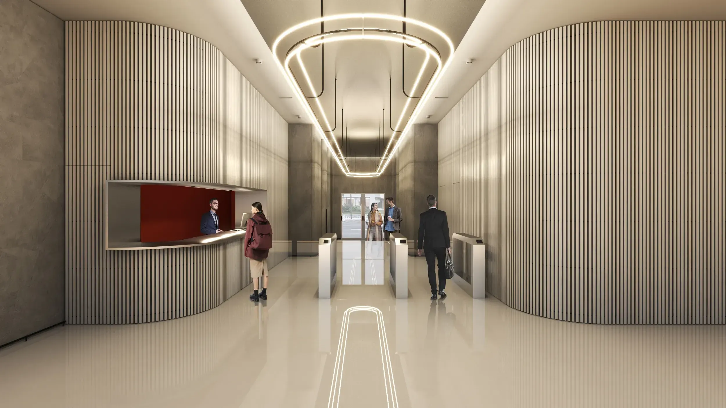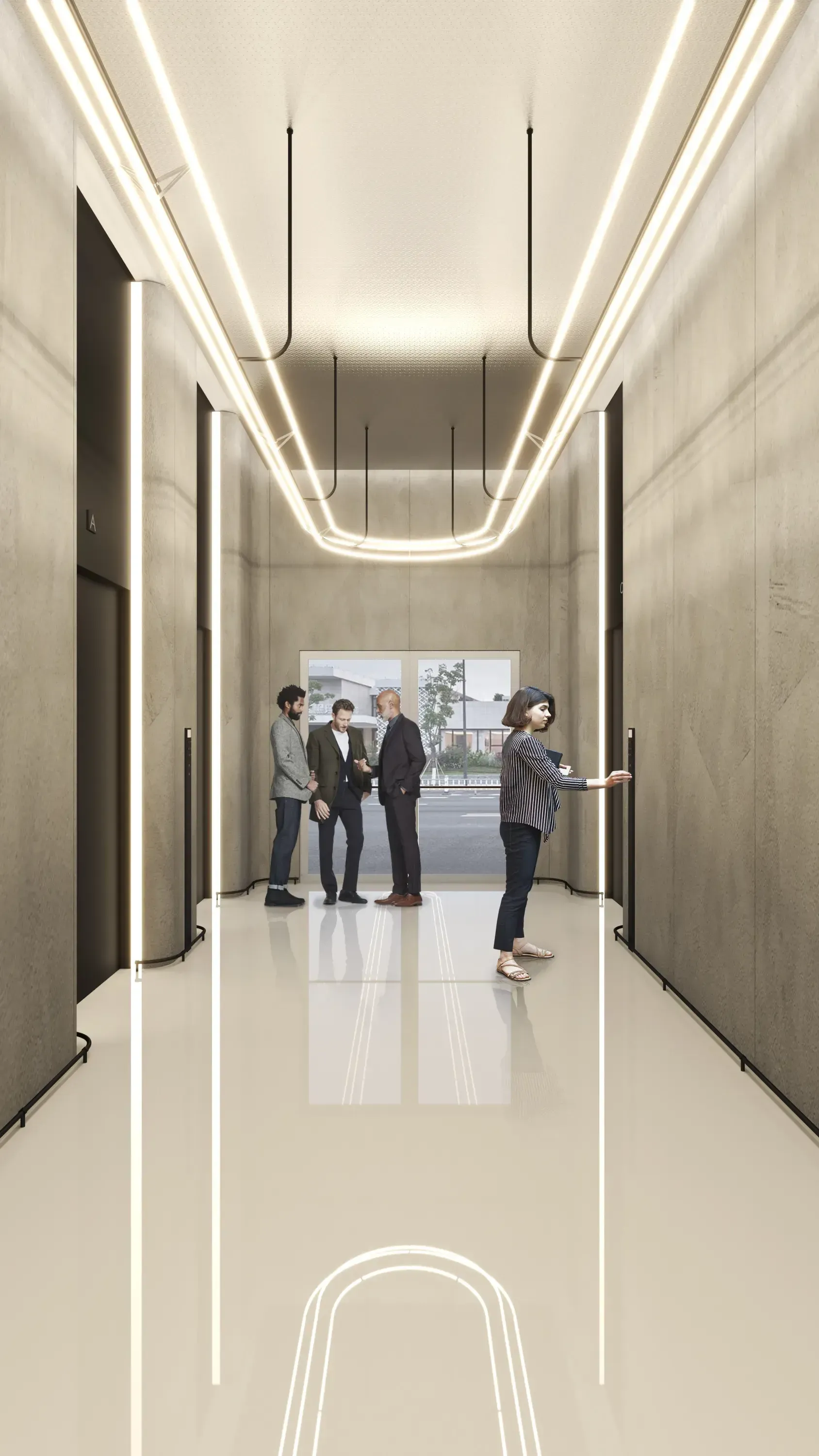 El atrio original funcionaba como espacio residual entre tres edificios: acabados grises y sin contraste más allá de la luz natural de muros cortina. La intervención actualiza la imagen al marco contemporáneo dotándolo de función específica.