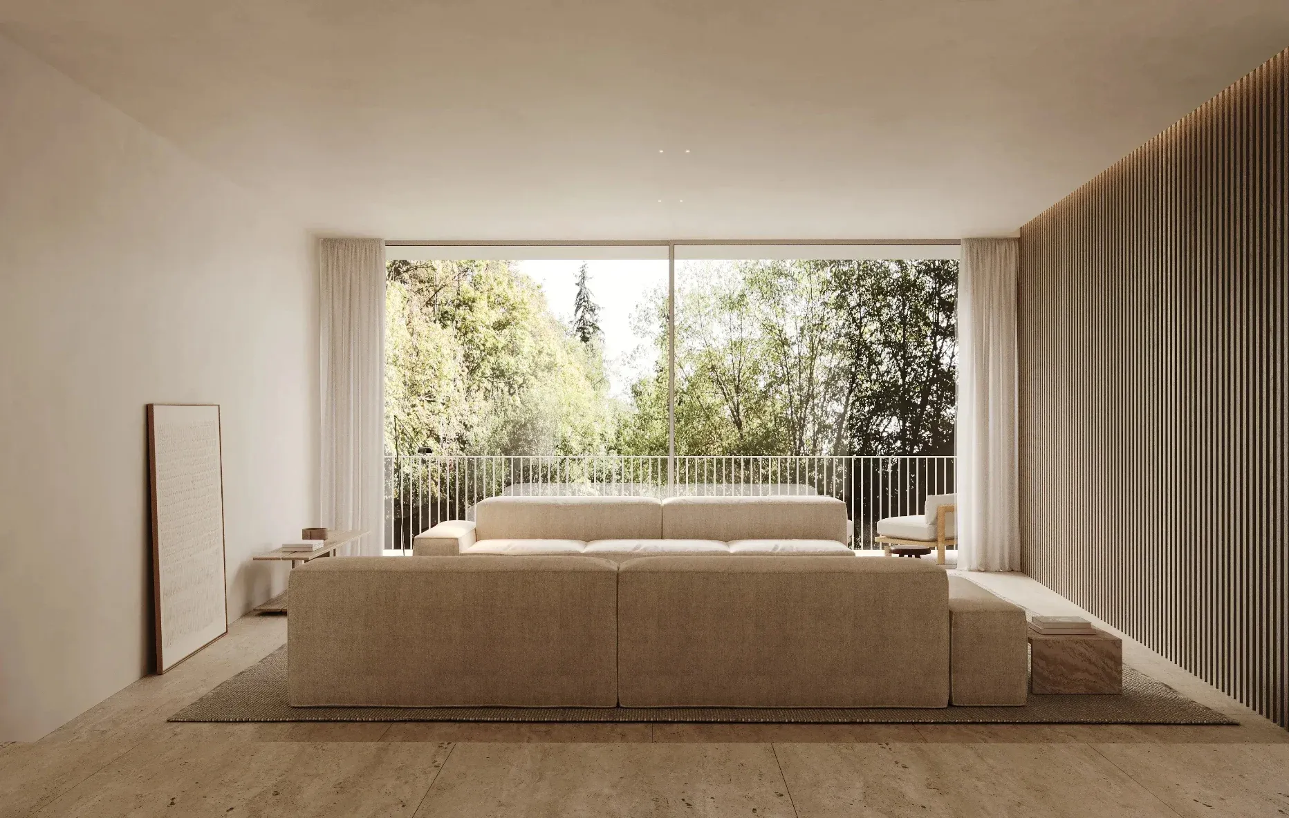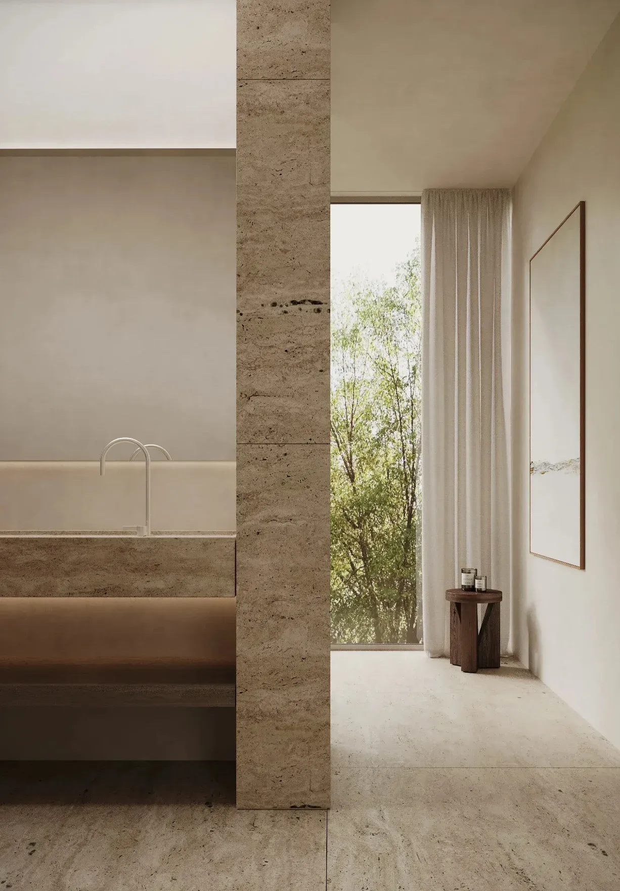 Los muros de hormigón se insertan en el terreno natural actuando como cimientos y estructura. Su aspecto ciego desde el lado de la montaña protege la intimidad frente a los elementos y la orografía.