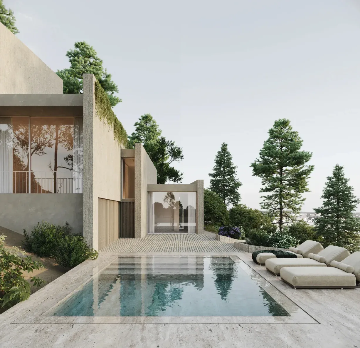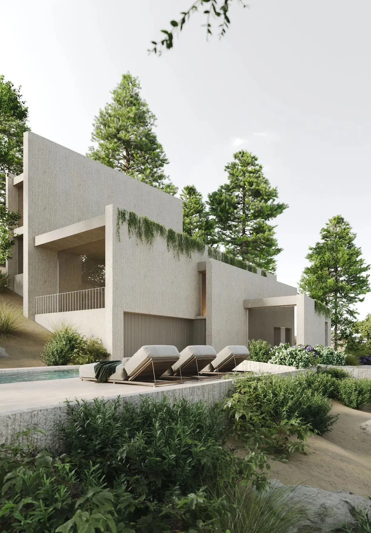 Diseñamos una vivienda en Calas de Guisando que dialoga con la topografía de su emplazamiento. El proyecto se asienta sobre terreno de pendiente pronunciada, característica que se convierte en la base sobre la que se desarrolla la arquitectura. La estrategia principal utiliza muros de hormigón armado insertados en el terreno natural, actuando como cimientos y estructura que anclan la edificación a la ladera.