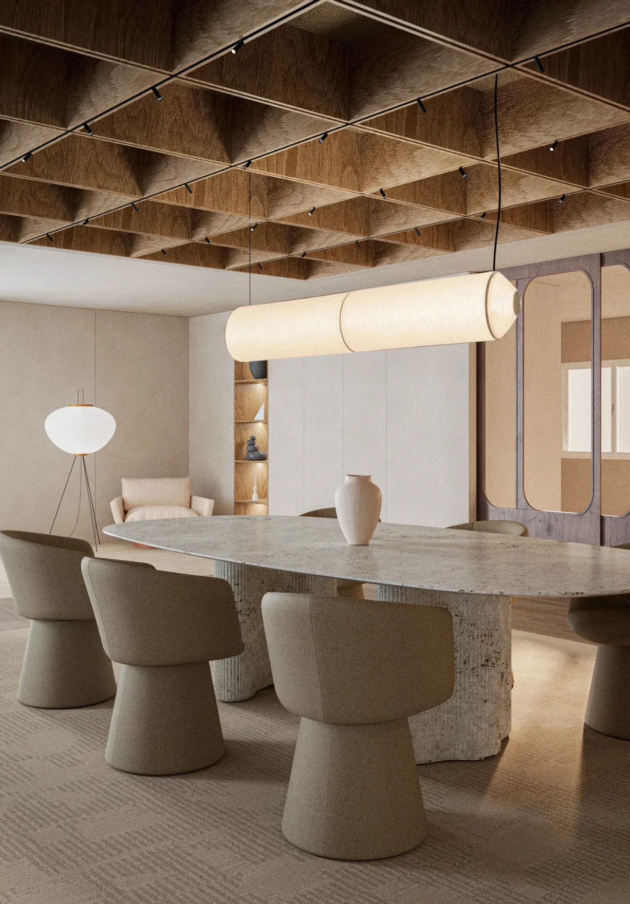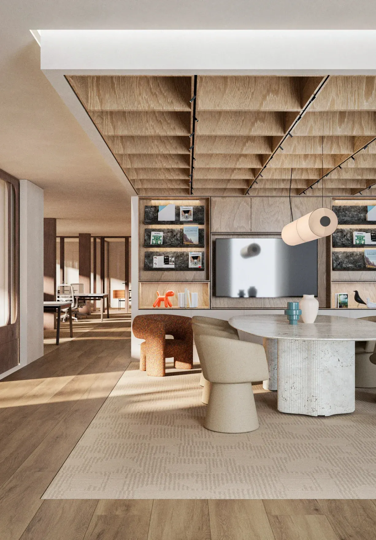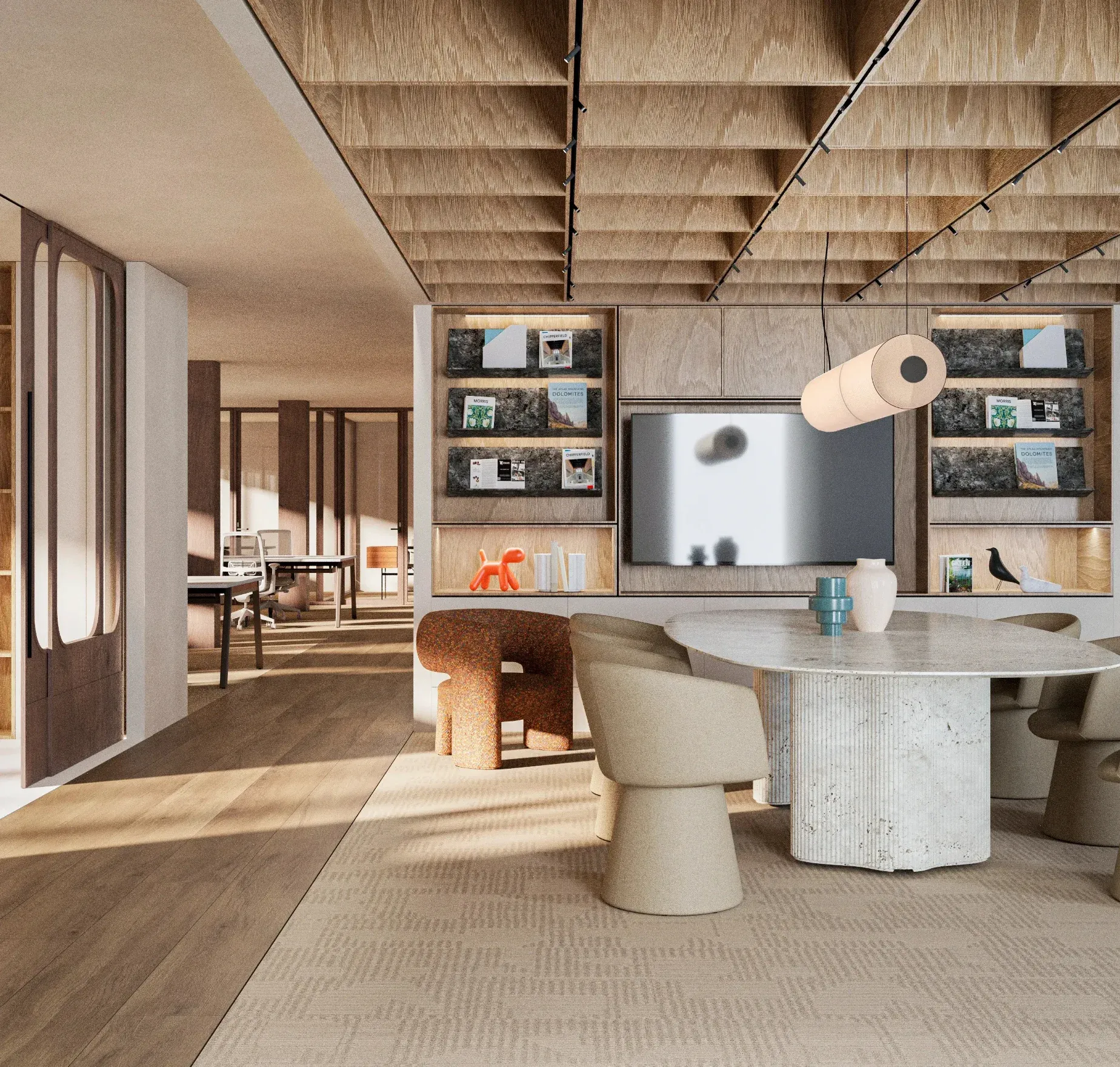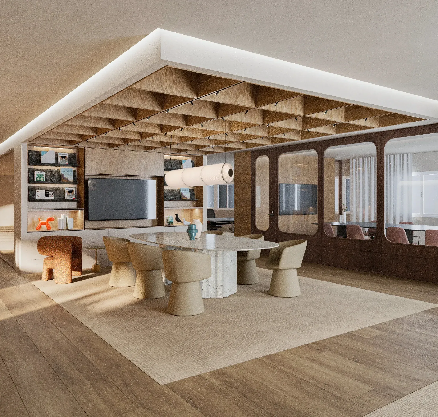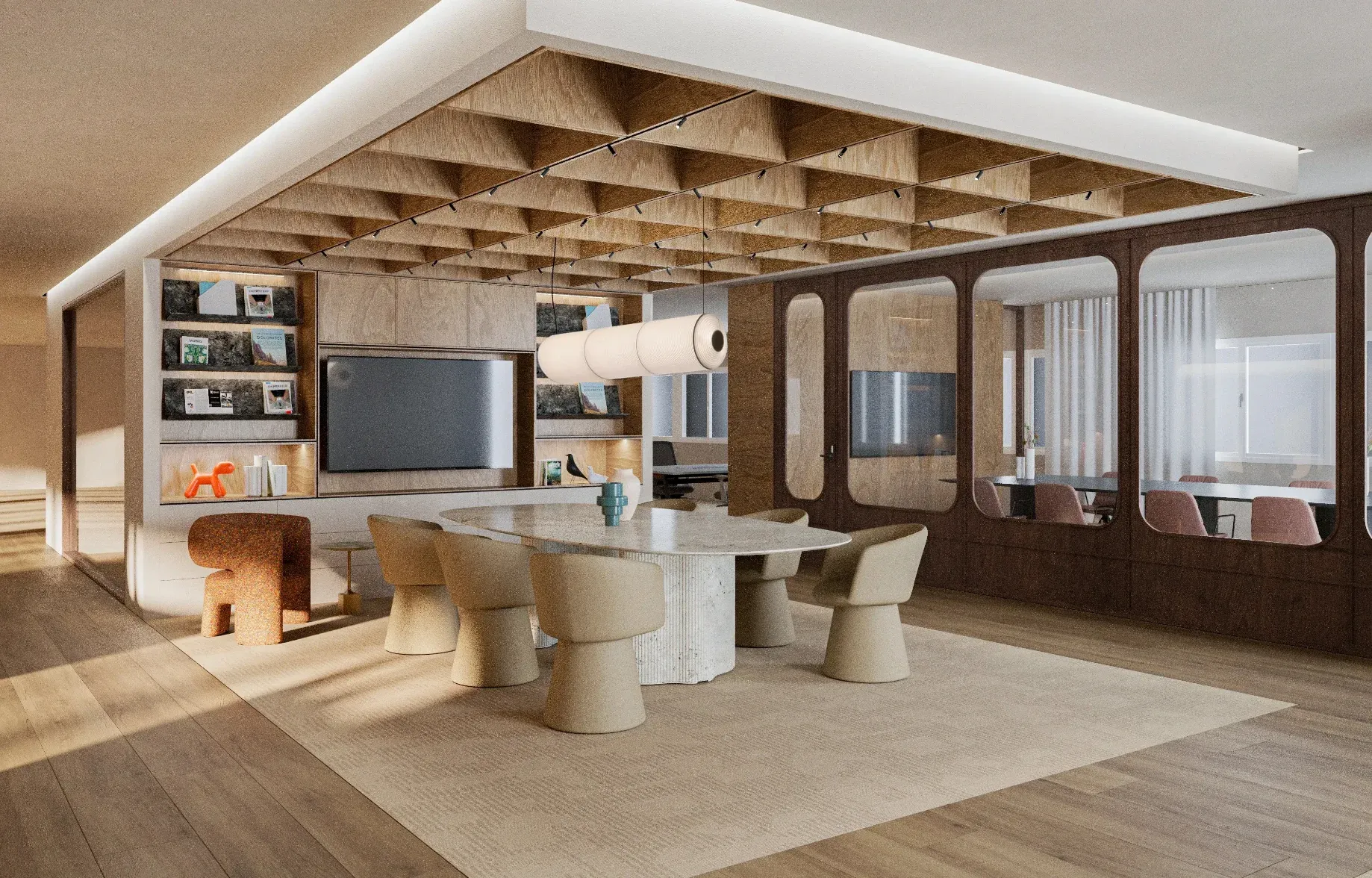 La celosía tridimensional de paneles de madera clara funciona como techo escultórico que contribuye a la acústica y alberga la iluminación empotrada. Este elemento se convierte en protagonista visual del espacio de trabajo.