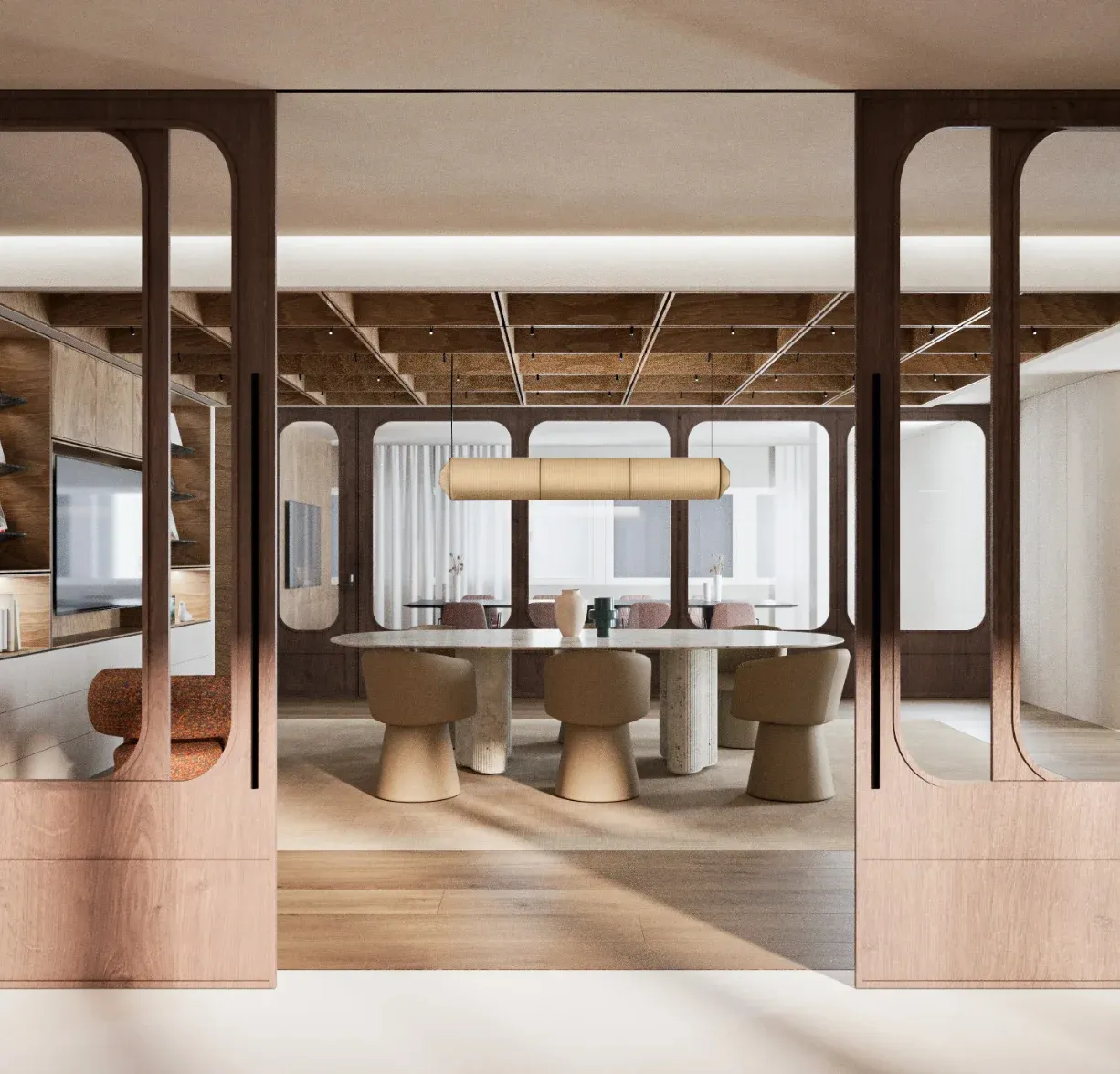 Las mamparas acristaladas con perfiles oscuros y arcos superiores definen áreas de trabajo sin sacrificar la conexión visual. Los revestimientos de madera clara aportan calidez y continuidad visual en todo el espacio.